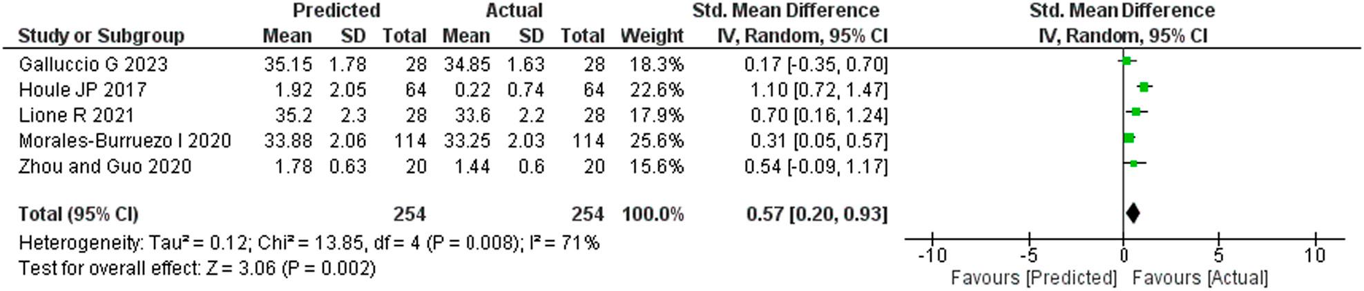 A meta-analysis was performed on five studies that provided the required dataset for quantitative analysis and depicted as a forest plot. Heterogeneity was more than 50% (I2 = 71%) and so a random effect model was applied. The change in inter-canine width after aligner treatment was lower than that predicted by the ClinCheck software (SMD: 0.57; 95% CI = 0.20 to 0.93; Z value = 3.06), and the difference was statistically significant (p = 0.002).
