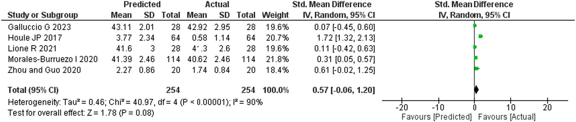 A meta-analysis was performed on five studies that provided the required dataset for quantitative analysis and depicted as a forest plot. Heterogeneity was more than 50% (I2 = 90%) and so a random effect model was applied. The change in inter-first premolar width after orthodontic treatment was lower than that predicted by the ClinCheck software (SMD: 0.57; 95% CI = -0.06 to 1.20; Z value = 1.78) but the difference was statistically non-significant (p = 0.008).
