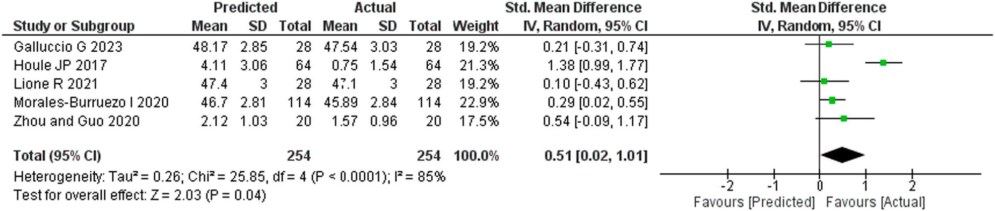 A meta-analysis was performed on five studies that provided the required dataset for quantitative analysis and depicted as a forest plot. Heterogeneity was more than 50% (I2 = 85%) and so a random effect model was applied. The change in inter-second premolar width after orthodontic treatment was lower than that predicted by the ClinCheck software (SMD: 0.51; 95% CI = 0.02 to 1.01; Z value = 2.03) and the difference was statistically significant (p = 0.04).