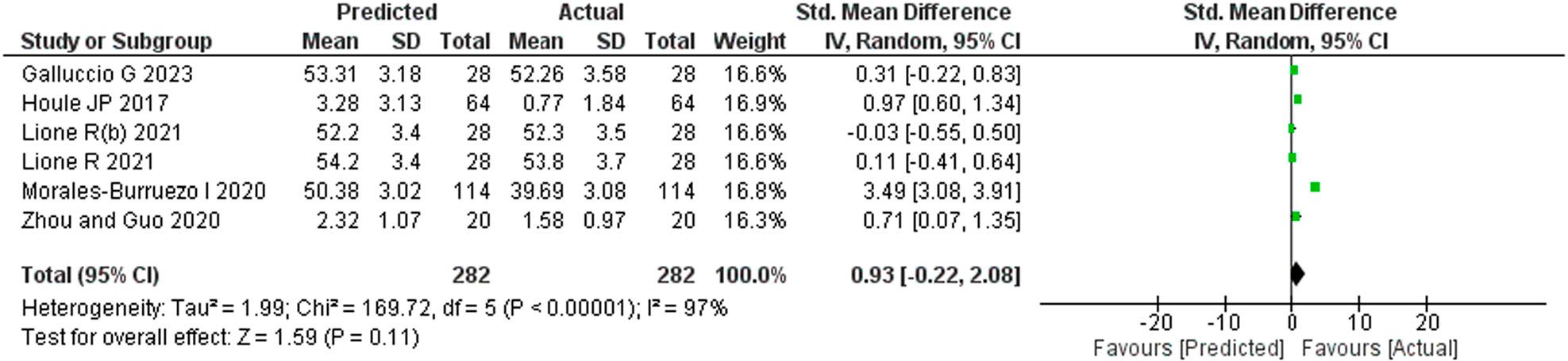 A meta-analysis was performed on five studies that provided the required dataset for quantitative analysis and depicted as a forest plot. Heterogeneity was more than 50% (I2 = 97%) and so a random effect model was applied. The change in inter-molar width after orthodontic treatment was lower than that predicted by the ClinCheck software (SMD: 0.93; 95% CI = -0.22 to 2.08; Z value = 1.59), but the difference was statistically non-significant (p = 0.11).