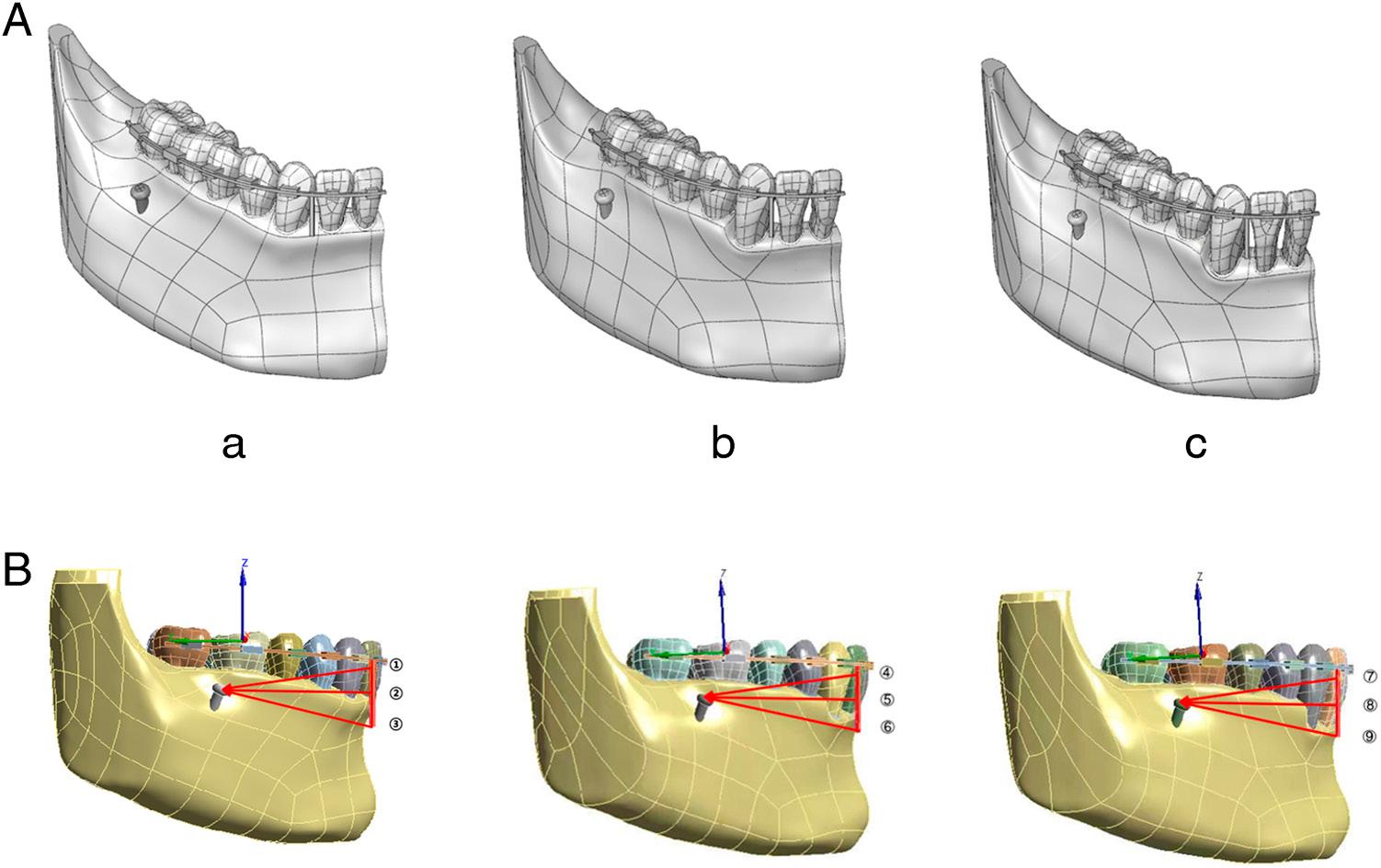 A, Construction of orthodontic models of mandibular anterior alveolar bone of different heights. (a) Alveolar bone not resorbed. (b) Alveolar bone absorbed by one third. (c) Alveolar bone resorbed by a half. B, Experimental conditions. Conditions 1−9: the effect of lever arm length (extended between lateral incisor and canine, conditions 1, 4 and 7: 2 mm, conditions 2, 5 and 8: 7 mm, conditions 3, 6 and 9: 12 mm, respectively).