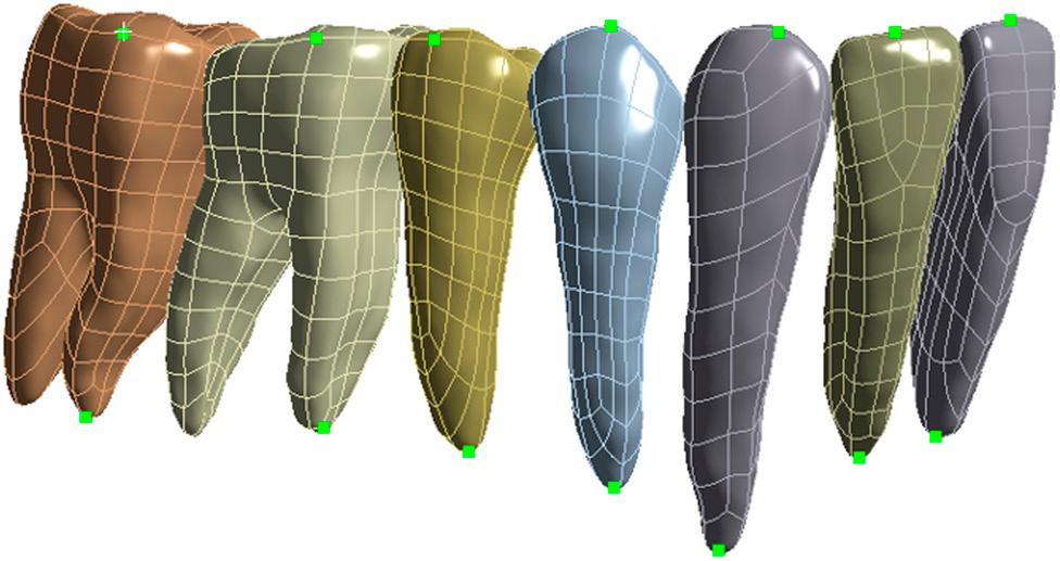 A standard co-ordinate system was constructed for each model. The displacements of the midpoints of the incisal edges and apical points of the incisors, the cusp and apical points of the canines, the buccal cusps and apical points of premolars, and the mesiobuccal cusps and mesial apical points of the molars were expressed in the x-, y-, and z-axes (Figure 2). The x-axis represented the direction of transverse movement, the y-axis represented the direction of anterior-posterior, and the z-axis represented the direction of vertical movements, respectively. The positive values of the x-, y-, and z-axes were defined as the medial, posterior and upward directions. Furthermore, the von Mises stress distribution in the periodontal ligament was recorded for each model. ANSYS 17.0 (Ansys Inc., Canonsburg, PA, USA) was used for the finite element analysis.