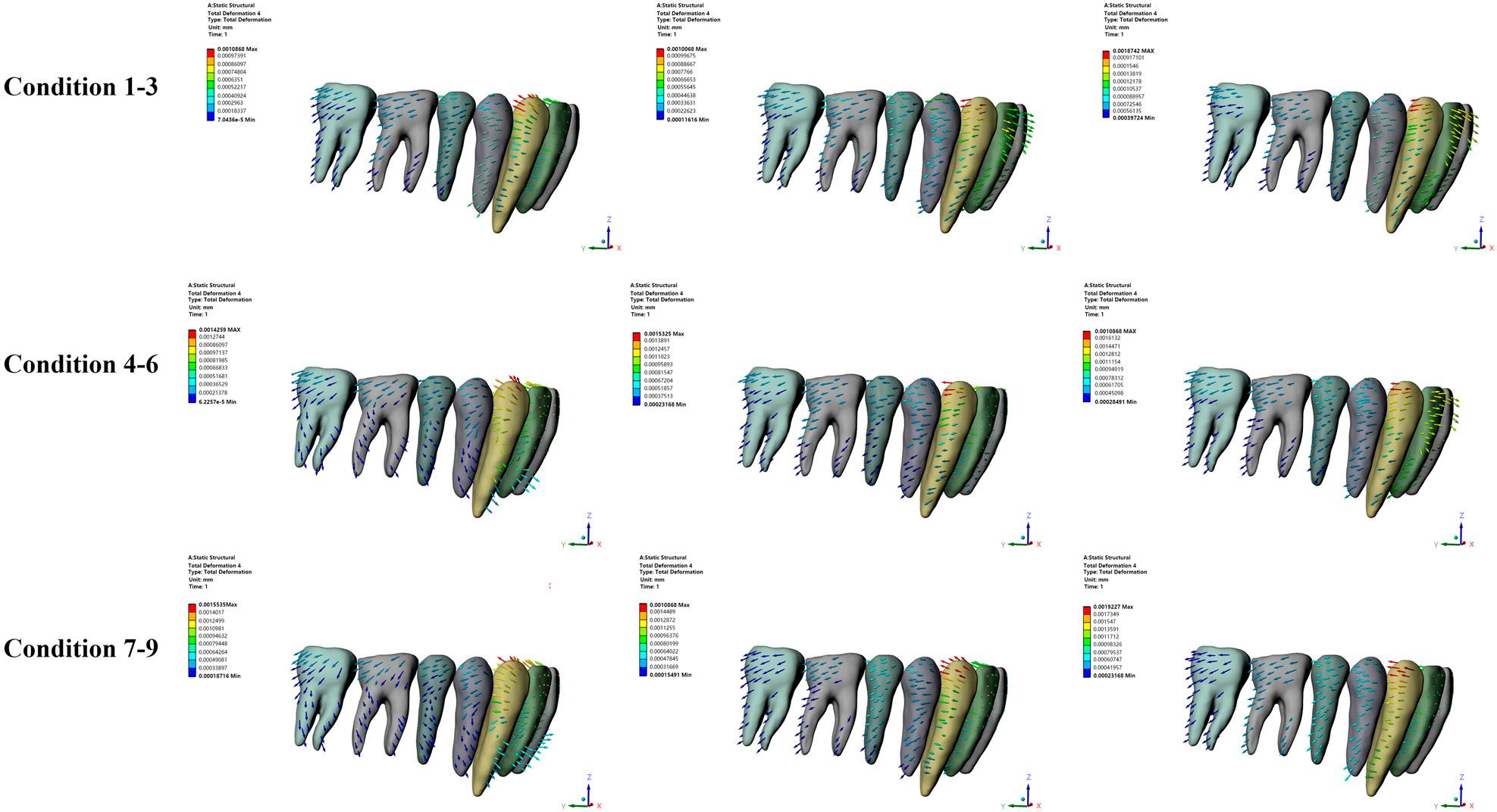 To investigate the tooth movement patterns and stress distributions at different levels of anterior alveolar bone loss after applying a distal force on the traction hooks of different heights, a distalisation force of 2.0 N was applied along a line from the mini-screw to the three different heights of the retraction hook: 2, 7 and 12 mm. For the boundary condition, all nodes at the base and distal extremities of the model were fixed in all directions. A bonded contact type was used to constrain relative sliding of the tooth-brackets, tooth-PDL, and alveolar bone-PDL. The contact between the bracket and the arch wire was set to “no separation”, which meant that under low-friction conditions, the arch wire moved along the bracket slot without separation in the vertical direction. The mini-screws were rigidly connected to the mandible.