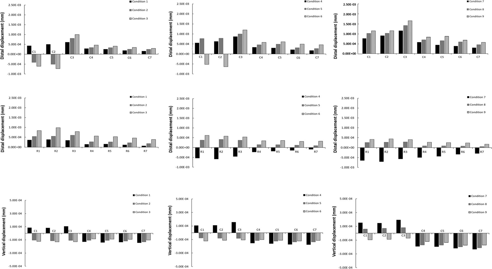 Displacement of the lower tooth crown (C) and root (R) in the sagittal direction and crown (C) in the vertical direction under different working conditions (mm).