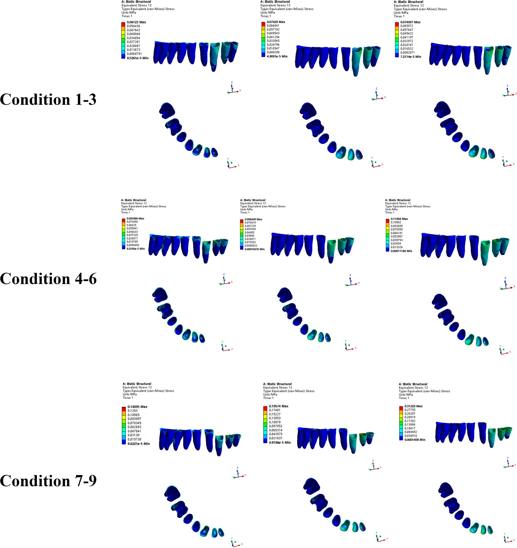 The von Mises stress distribution in the PDL under different conditions (Mpa).