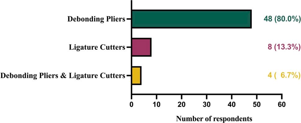 Most participants (80%) preferred to use debonding pliers to remove attached brackets, followed by ligature cutters (13%), or a combination of using ligature cutters and debonding pliers (7%) (Figure 1).