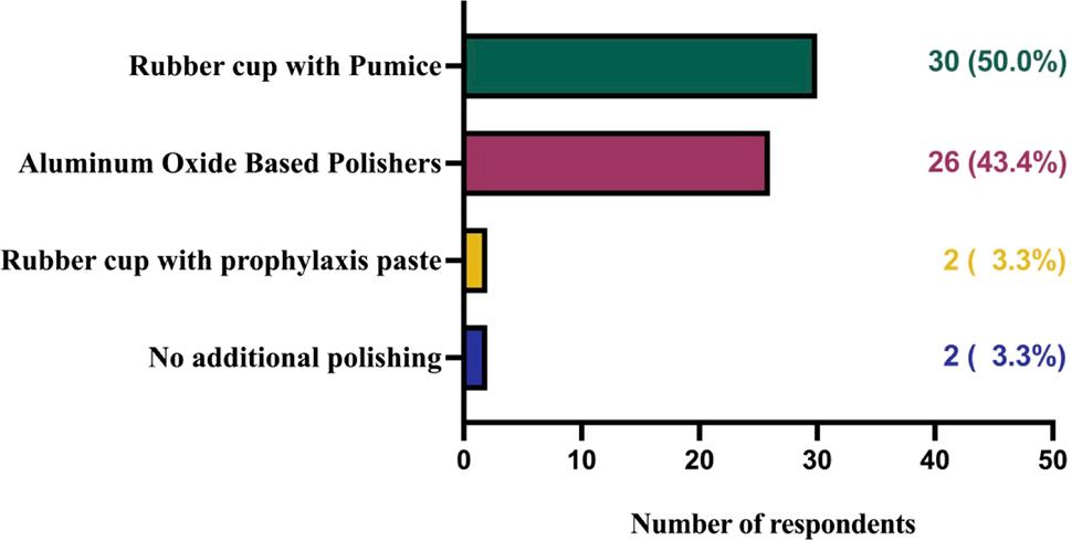 After the removal of residual adhesive, almost all (97%) respondents carried out additional polishing (Figure 4). Rubber cups and pumice (50%) was the most used method, closely followed by aluminium oxide-based polishers (44%). Most participants (77%) did not use water irrigation nor dental loupes during debonding, and the majority (69%) usually allocated 30 to 60 minutes for the debonding process (Table II).
