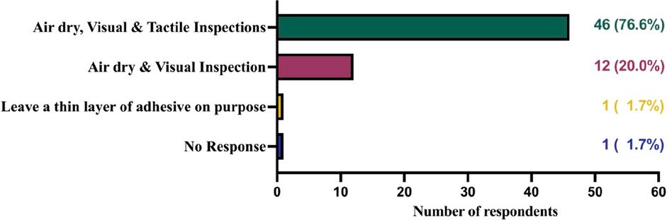 Most respondents used a combination of visual and tactile (with either an explorer or periodontal probe) inspections after drying the tooth surface to assess the removal of the residual adhesive (78%) (Figure 5). There was an unexpected response from one orthodontist who, on purpose, left a thin layer of orthodontic adhesive on the tooth surface to avoid any iatrogenic damage.