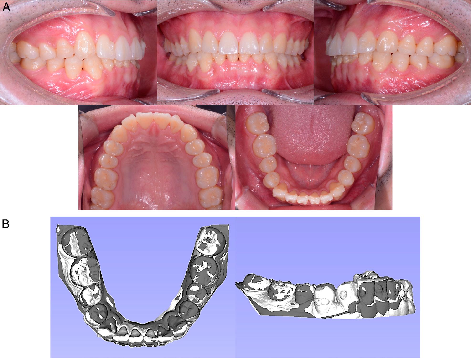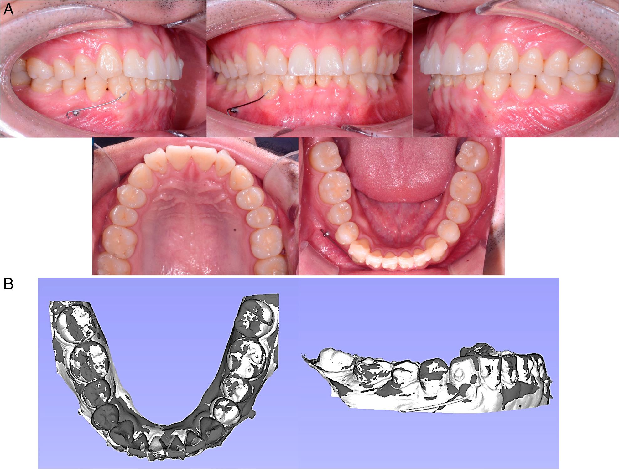 Finally, treatment using clear aligners was considered.3,8 However, it was anticipated that aligner therapy would pose difficulties in adjusting the right mandibular canine.7,8 To address this, it was planned to manage the problem by using a bracketless NiTi wire first, followed by clear aligners to detail the remaining malocclusion.20