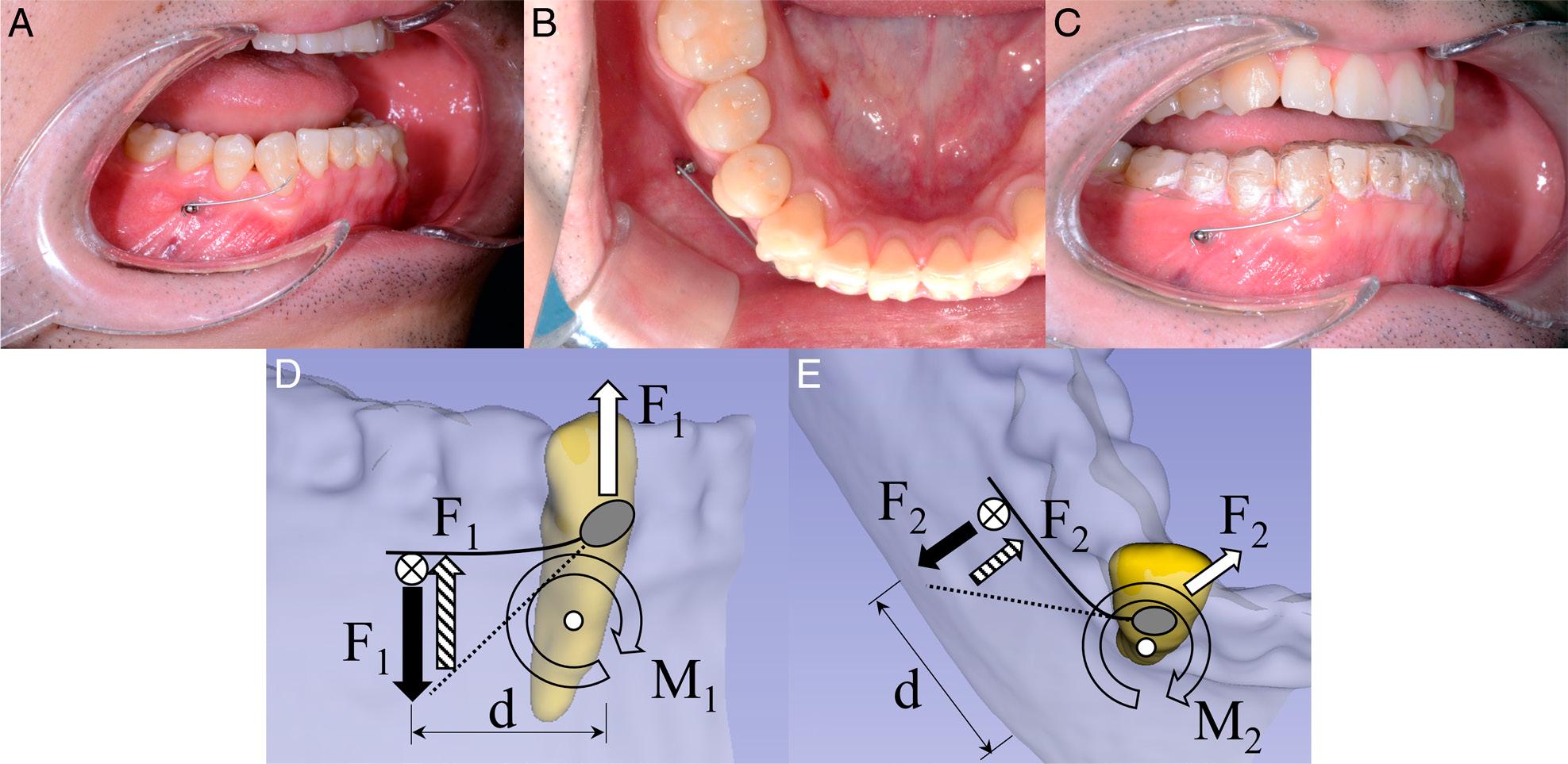 The force diagram of the treatment mechanics is shown in Figure 6. In the oblique view (Figure 6D), a cantilever is activated with a force F1 (indicated by a striped arrow). This force is delivered to the canine (denoted by a white plain arrow) at the resin attachment point. The reaction force (represented by a black bold arrow) is transferred to a micro-implant. All forces have the same magnitude as F1. Consequently, by the law of equilibrium in physics, a root distal moment M1 = F1×d is produced. Using a similar logic, the crown mesial-out rotation moment M2 = F2×d is predicted from the occlusal view (Figure 6E). By using a NiTi wire, these moments were delivered in a light-continuous manner, which is the most effective and efficient orthodontic loading pattern.24 However, the forces F1 and F2 exerted on the canine crown (white plain arrows) and the root distal moment M1 could lead to undesired crown movement in the occlusal-lingual-mesial direction. With the use of aligners, this unwanted movement can be restricted by the appliances.