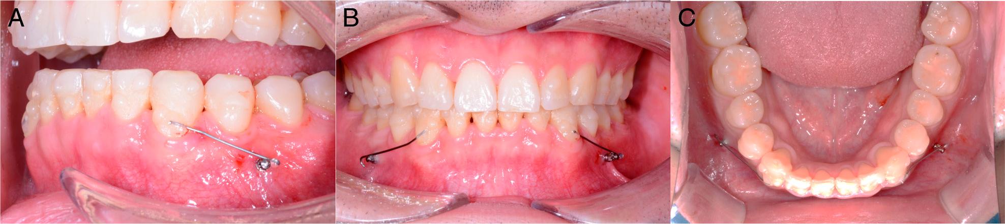 Intraoral photographs after the bonding of bracketless nickel-titanium wires.
