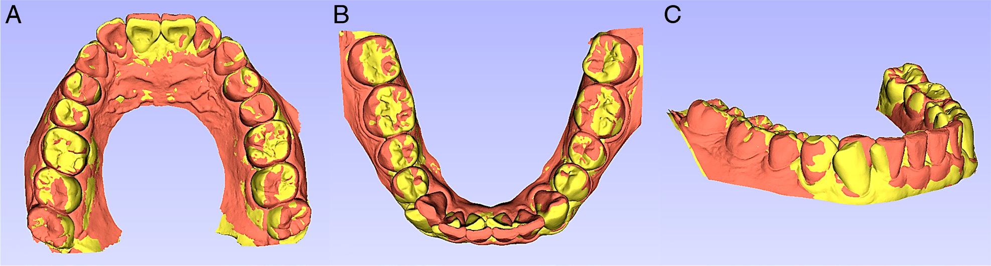 Model superimposition. The yellow colour denotes the pre-treatment model, and the orange colour represents the post-treatment model. The registrations were performed on the occlusal surfaces of the first and second molars. A, Maxillary dentition. B, Mandibular dentition. C, Oblique view.