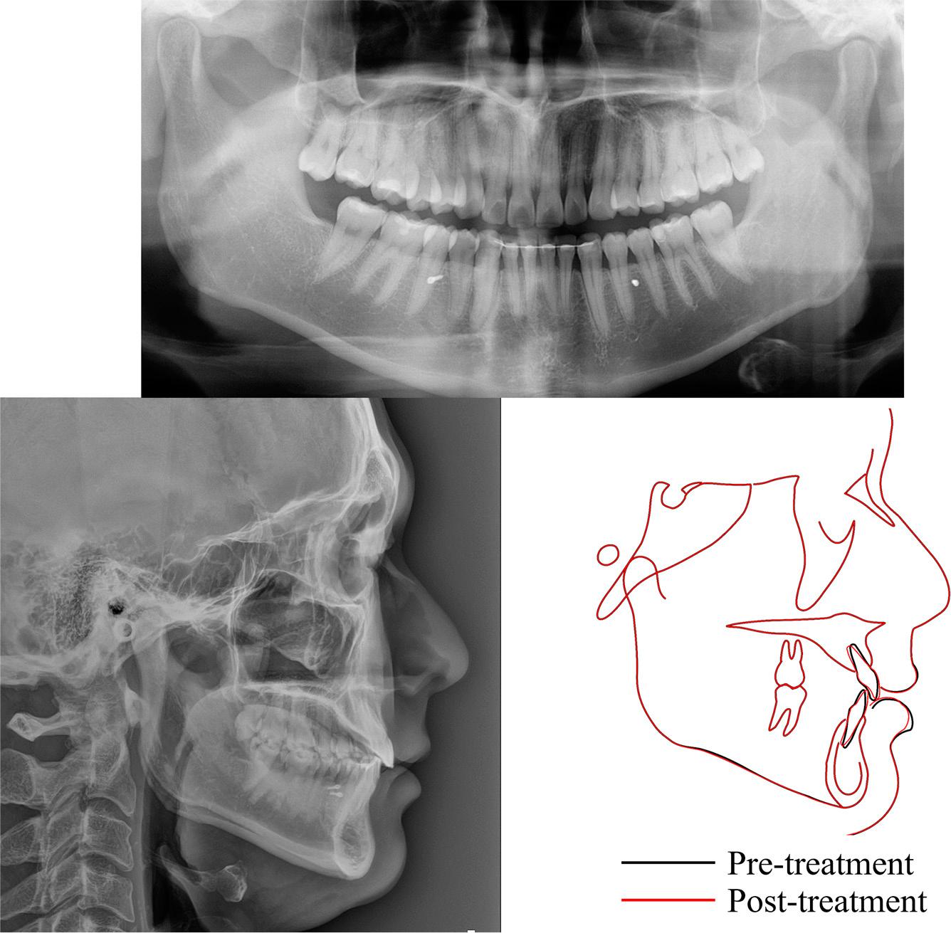 Post-treatment radiographic records, including panoramic, lateral cephalogram, and the superimposition of cephalograms taken at pre- and post-treatment.