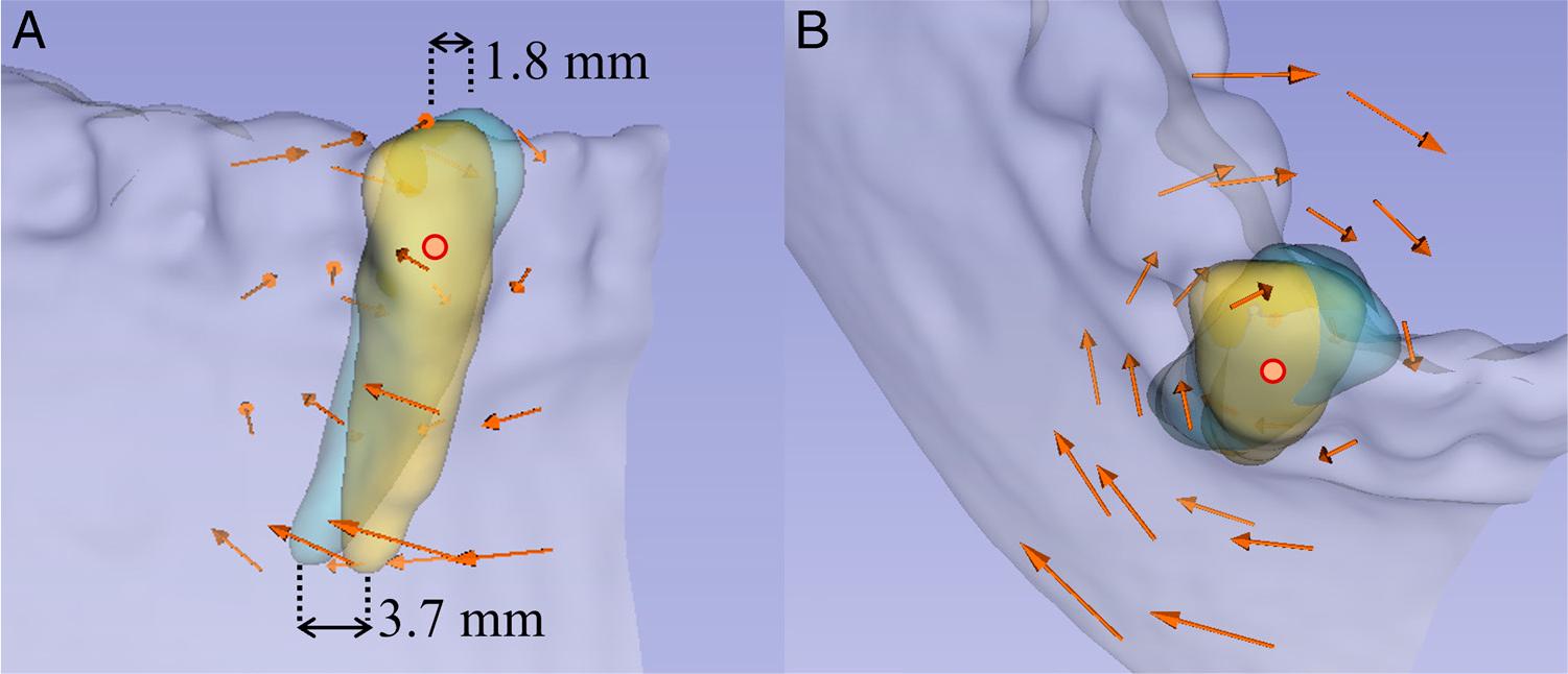 Voxel-based registration of the mandibular cone-beam computed tomography image. For simplicity, the post-treatment mandible was omitted. The yellow canine corresponds to the pre-treatment state, while the blue canine represents the post-treatment state. The orange-coloured arrows around the canines are the displacement vectors depicting the three-dimensional movements during treatment. A, Oblique view. B, Occlusal view.