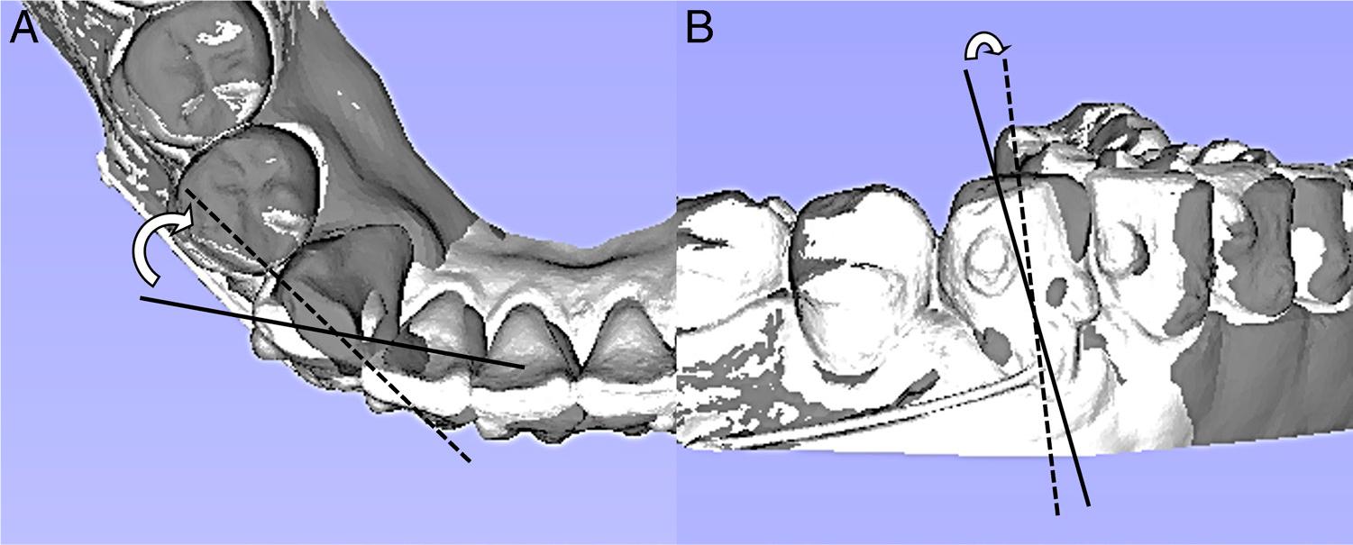 Rotation and angulation measurements between the initial and the predicted or achieved models. The white model serves as the reference, while the dark model represents either the planned or achieved state. Reference lines are depicted with plain lines, and target lines as dotted lines. Arrows indicate the angles between the reference lines. A, Rotation. B, Angulation.