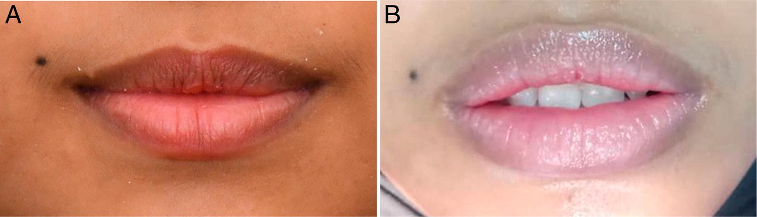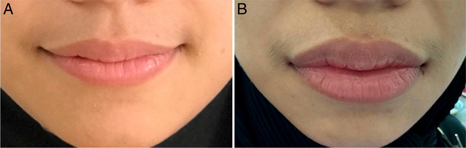 Upper and lower lips; (A) Pre-treatment; (B) Dryness and swelling.