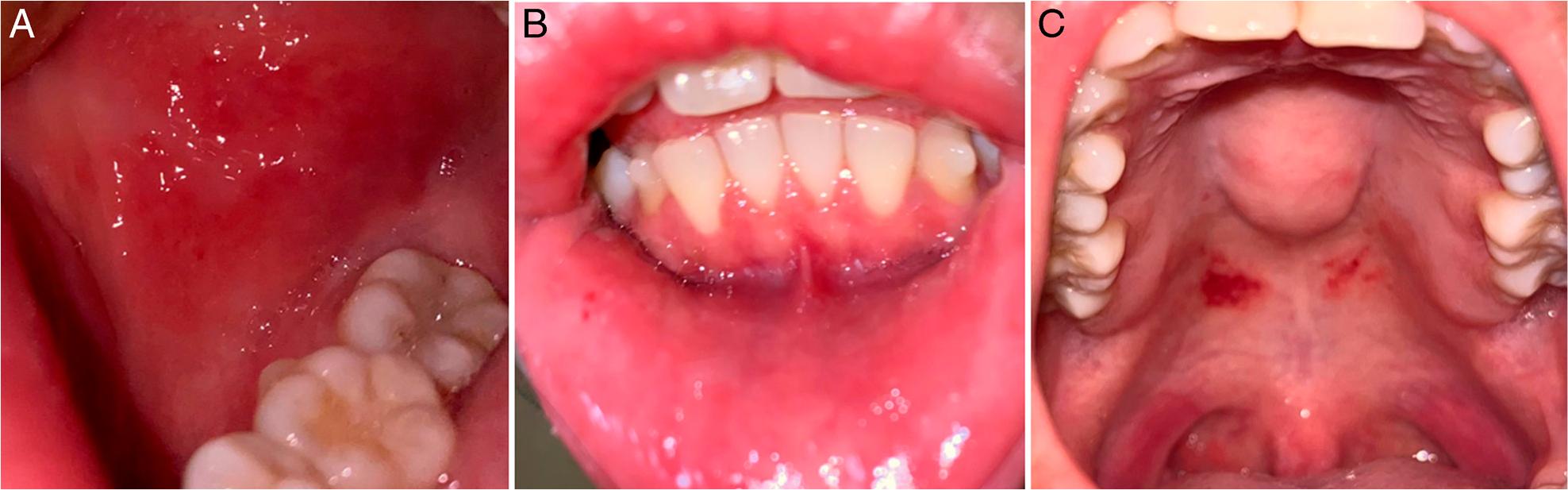 (A) Redness and thickening of the buccal mucosa; (B) Pin head ulceration on the labial mucosa; (C) Localized reddish lesion on the soft palate.