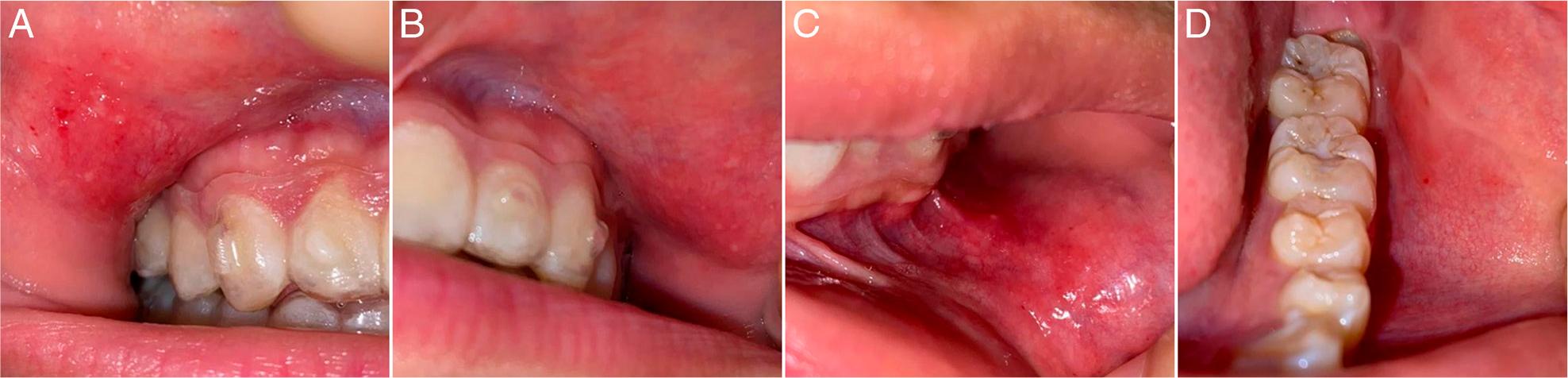 Redness and a pinhead-sized ulcer at the buccal mucosa of the attachment site (A) upper right; (B) upper left; (C) lower left canine area; (D) lower posterior left.