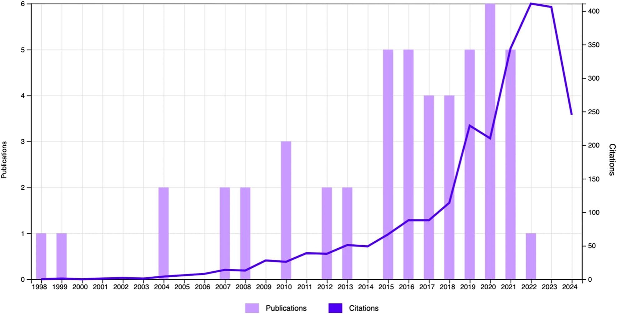 Correlation between the 50 most cited articles (1998–2022) and their citation trends over time.