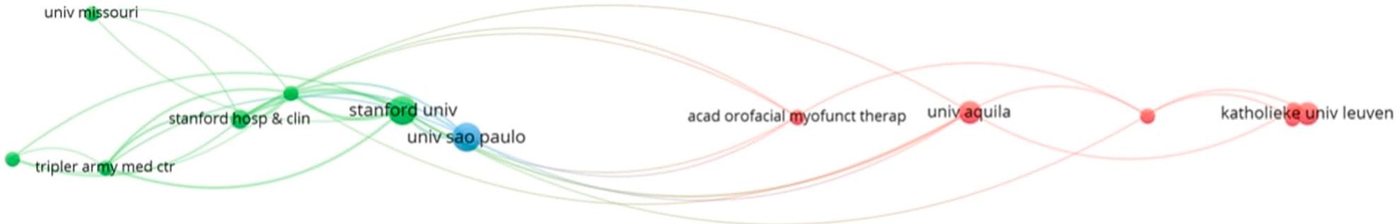 Eleven countries published at least two articles on myofunctional therapy. The United States led with 18 articles (958 citations), followed by Brazil (10 articles, 433 citations) and Italy (9 articles, 378 citations) (Table II). Germany (79.8) and Taiwan (77.5) had the highest average citation counts per article. Italy, the United Kingdom and France had the strongest collaboration networks, with link strengths of 11, 10, and 10, respectively. The United States collaborated with Germany, the United Kingdom, Brazil, and Australia.