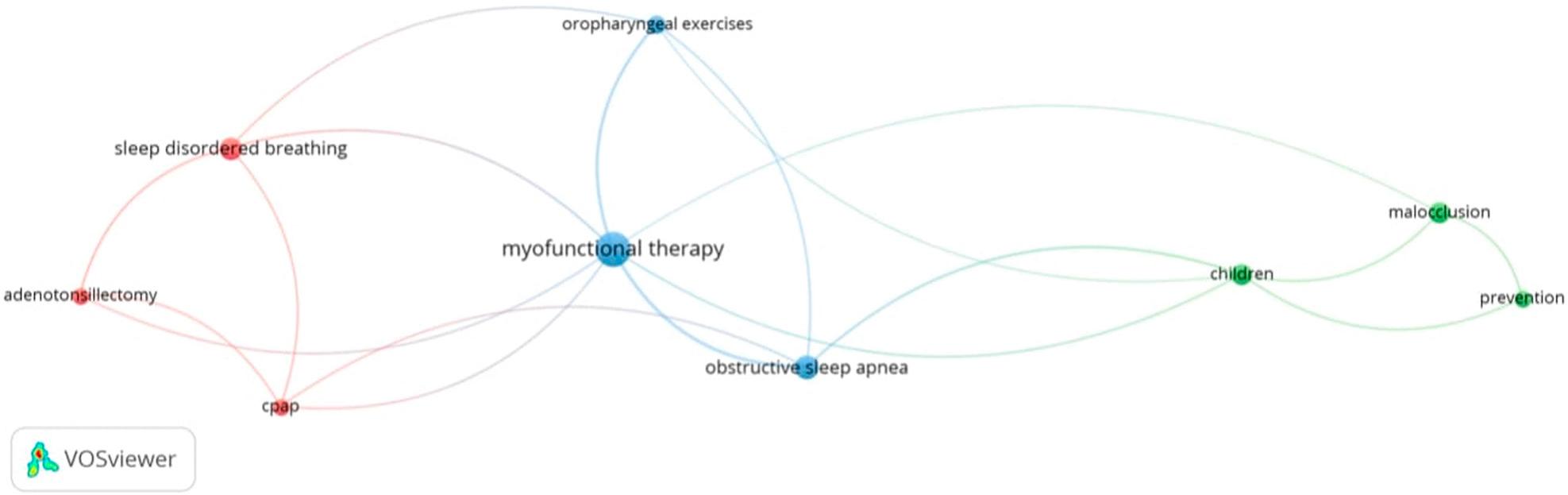 The association between keywords clearly demonstrates the interaction between various disciplines and underscores the interdisciplinary nature of myofunctional therapy. The most commonly occurring keyword was “myofunctional therapy”, reaffirming its pivotal role in the field. Other frequently appearing terms included “obstructive sleep apnoea and “sleep-disordered breathing”, thereby emphasising the link between myofunctional therapy and respiratory health. Around these central terms, distinct groupings emerge, forming two primary conceptual clusters: one related to sleep disorders, CPAP (Continuous Positive Airway Pressure) treatment, and sleep-disordered breathing, and the other associated with orthodontics, malocclusions, and children. The notable co-occurrence of myofunctional therapy and sleep-disordered breathing indicates a growing clinical and academic interest in its applications beyond conventional orthodontic frameworks, extending into respiratory and sleep medicine. In addition, the frequent linkage of malocclusion and orthodontic treatment reinforces the well-established role of myofunctional therapy in dentofacial development in children and malocclusion correction. These observations offer insights into the expanding interdisciplinary nature of myofunctional therapy, possibly shaping future research trajectories. Given that physicians are often the primary healthcare providers who evaluate children, myofunctional therapy serves as a key resource for early referrals to dentists and orthodontists, thereby ensuring that relevant treatment aspects within their scope are effectively managed. This highlights the significance of cross-disciplinary collaboration and the necessity for stronger cohesion between dentistry, sleep medicine, and associated medical fields in myofunctional therapy.