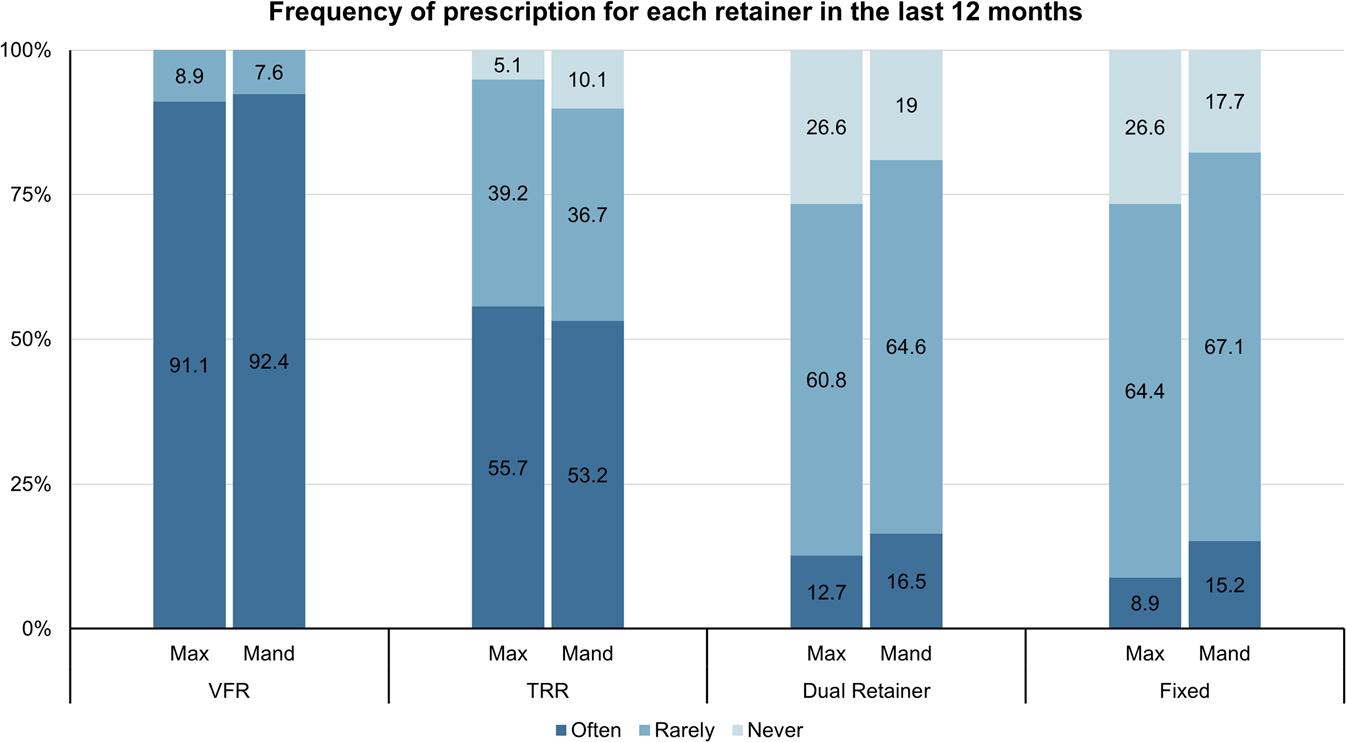 Frequency of prescription for different types of maxillary and mandibular retainers in the past 12 months.