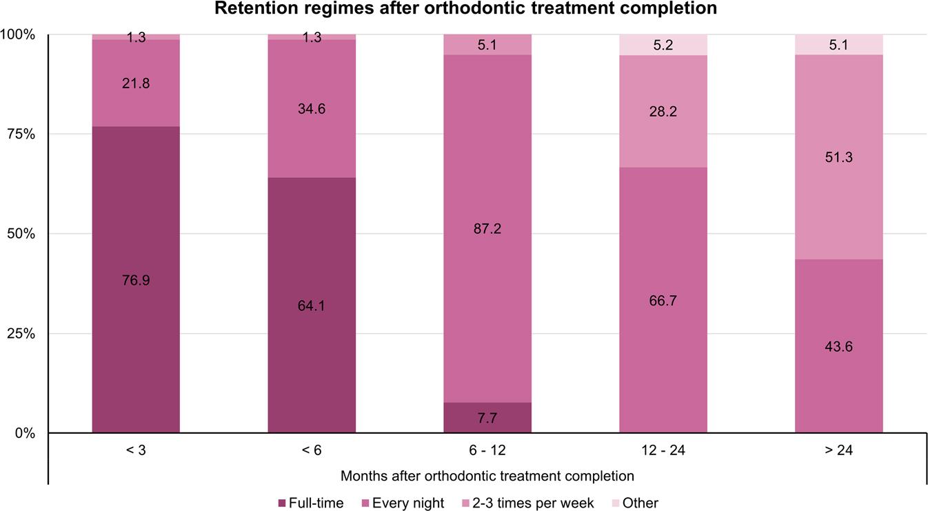 Similarly, no evidence-based recommendation exists regarding the duration of wear for removable retainers during the initial retention phase.7 This has resulted in significant variation in retention protocols, which range from 6 to 24 hr of daily wear.11,12 Studies have highlighted this variation, particularly research conducted in the Netherlands which revealed an inverse correlation between the prescribed number of hours of wear and the duration of the initial retention phase.10 A systematic review concluded that there is insufficient evidence to recommend the most effective retention protocol.19