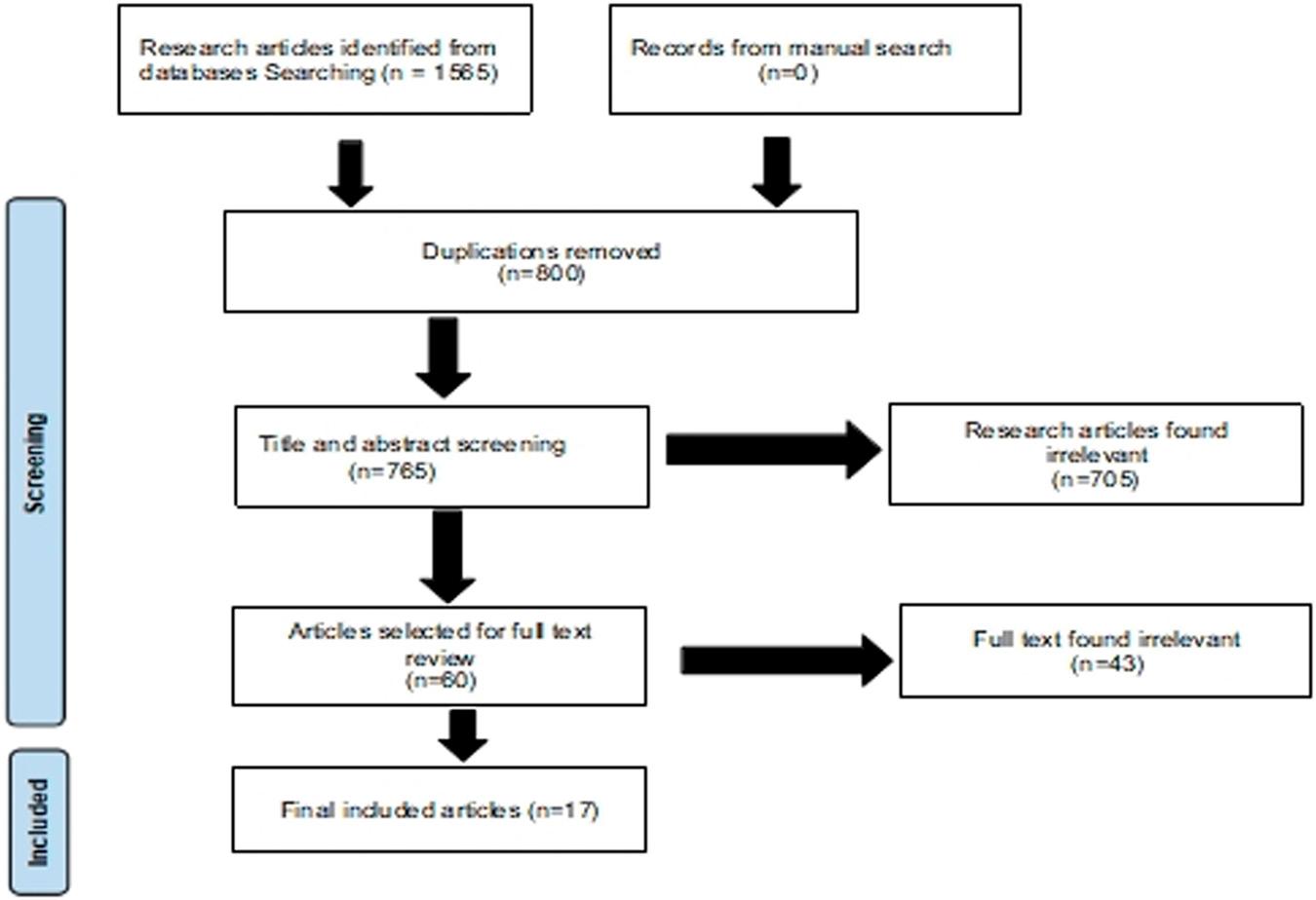 A detailed online search by two researchers across different databases extracted 1565 relevant studies, of which 765 articles remained after duplicates were removed. The initial screening of titles and abstracts of the 765 articles further removed 705 irrelevant studies. Thereafter, 60 studies were deemed potentially relevant and were selected for a full text review. A detailed review of these studies excluded 43 articles and finally 17 studies fulfilled the selection criteria and were enrolled in the meta-analysis.12–28 Steps taken during the selection process are depicted in the flow diagram (Figure 1).