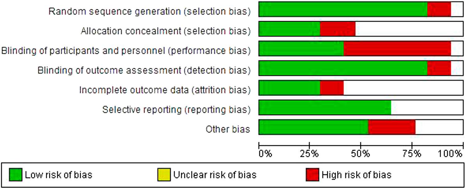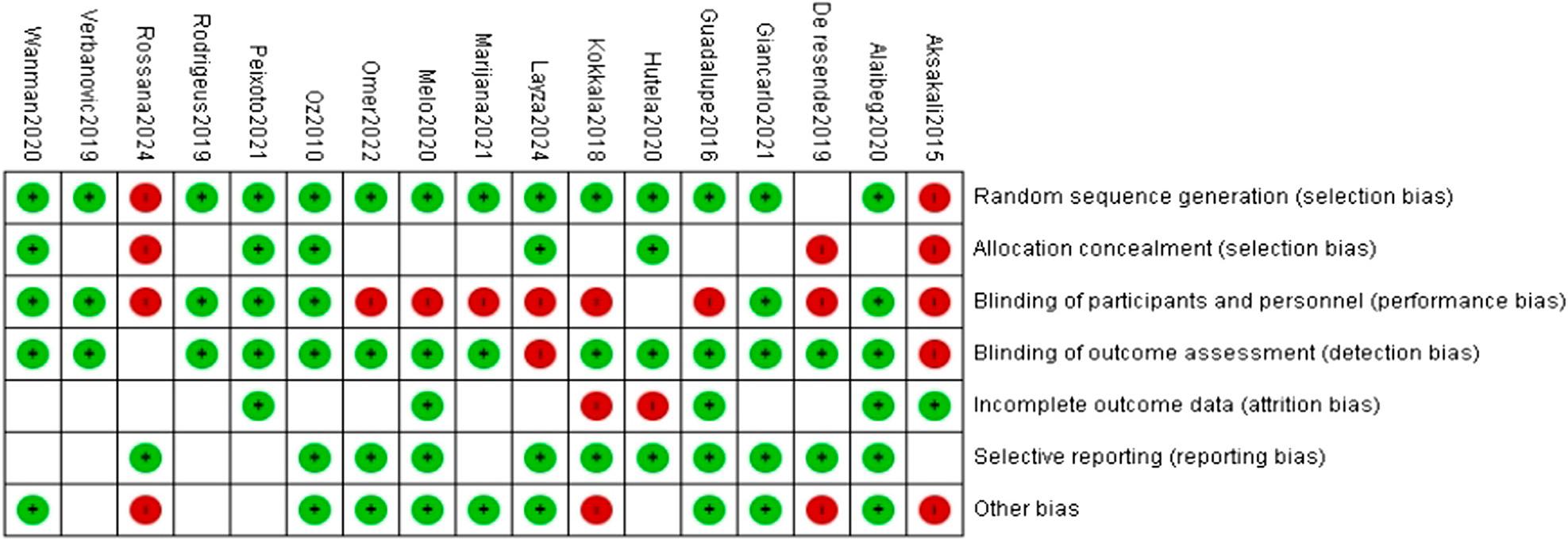 The risk of bias assessment revealed that most studies demonstrated a low risk of bias in random sequence generation, outcome blinding, and selective reporting, indicating adherence to robust methodological standards in these areas. However, allocation concealment and blinding of the participants and personnel showed a mix of low and unclear risk, with some studies exhibiting a high risk, and reflected variability in reporting or execution. Incomplete outcome data were generally well-addressed, although a minority of studies had unclear or high risk. Other sources of bias were identified in a significant number of studies, which highlighted potential methodological concerns. The findings suggested variability in study quality, warranting cautious interpretation of the meta-analysis results.