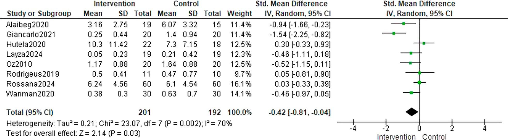 | 2 | Depression | -0.42 (-0.81 to -0.04) | 0.03 | 70% (Moderate) | Moderate |