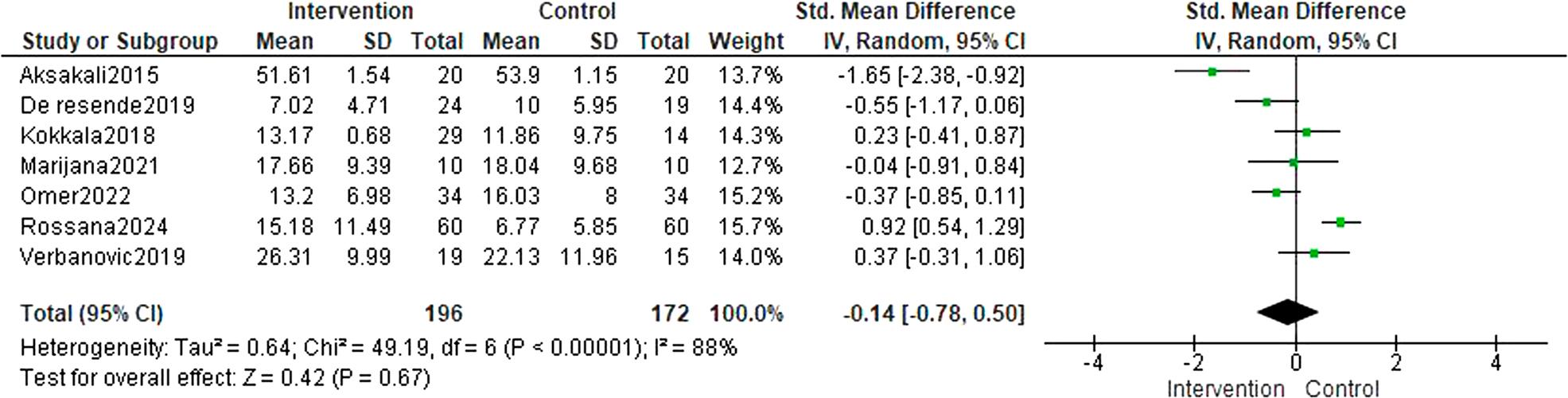The meta-analysis of occlusal splint therapy effect on sleep quality showed a moderate effect size (SMD = -0.54, 95% CI = -1.22 to 0.14) suggesting a potential benefit, but the effect was statistically nonsignificant (P = 0.12). This trend, though notable, was inconclusive. The high heterogeneity (I2 = 71%) indicated substantial variability between the studies, likely due to differences in study design or sample characteristics. The overall effect test (Z = 1.55, P = 0.12) further supported the lack of statistical significance, as the p-value remained above the 0.05 threshold (Figure 7).