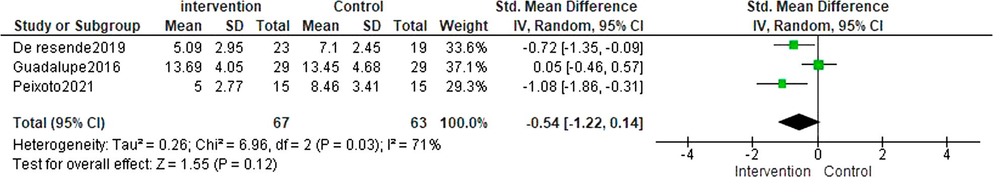 | 4 | Sleep Quality | -0.54 (-1.22 to 0.14) | 0.12 | 71% (High) | Low |