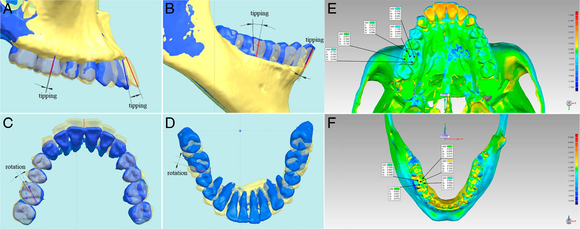 Measurement of tooth movements. A. Disto-mesial tipping angles of the upper molars and labio-lingual tipping angles of the upper incisors; B. Disto-mesial tipping angles of the lower molars and labio-lingual tipping angles of the lower incisors; C. Rotation angle of the upper molars; D. Rotation angle of the lower molars; E. Displacement of the upper molars; F. Displacement of the lower molars.