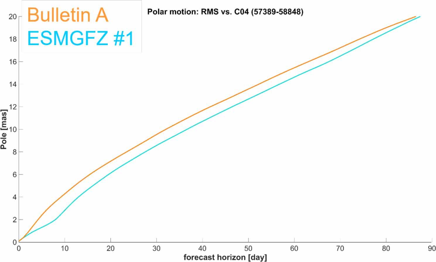 RMS error of polar motion prediction compared to IERS 14C04 of Bulletin A (orange) using no EAMF data and ESMGFZ submissions #1 to EOPPCC (blue) using the ESMGFZ EAMP product