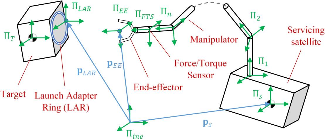 Small, unmanned servicing satellites will be used to conduct in-orbit servicing and active debris removal missions (Luu and Hastings, 2021). Capture of the target object will be a major challenge of the proposed missions (Fehse, 2014). One of the considered ways to perform the capture operation is to use a gripper mounted on a robotic manipulator (Shan et al., 2016; Henshaw et al., 2022). The contact forces between the gripper and the elements of the target object will occur in the grasping phase (Oleś et al., 2017). These forces can result in a very high load acting on the manipulator or they can cause the target object to drift away from the servicing satellite. Thus, managing the contact dynamics between the satellite-manipulator system and the target object is one of the fundamental capabilities required to enable servicing and active debris removal missions (Tasker and Henshaw, 2008).