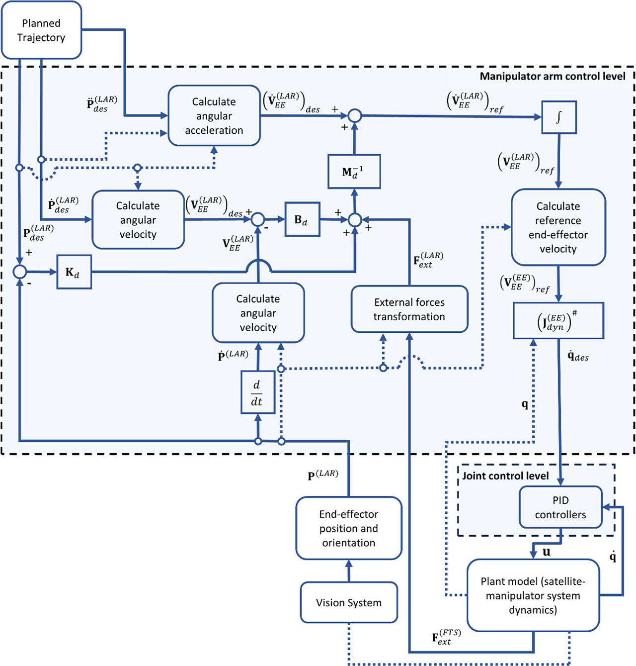 Various approaches are proposed to control the manipulator during its interaction with the environment (Villani and De Schutter, 2016). The compliant control can be divided into two main categories: (i) the active compliant control and (ii) the passive compliant control. In the active compliant control, the compliance is achieved entirely due to control, while in the passive compliant control, it is achieved entirely due to mechanics (Calanca et al., 2016). In the passive compliant control the contact with the environment is controlled using an element of elasticity like a soft interface to the environment, whereas the classical position control law is considered. The active compliant control is divided into direct force control and indirect force control. Direct force control includes hybrid force and position control proposed by Raibert and Craig (1981). In such an approach, the task space is decomposed into different sets and directions, where either motion or force is controlled. The indirect force control allows to regulate the dynamic interaction between the manipulator and its environment. As a consequence, the relationship between forces and motion is regulated. Such a method is very useful for in-orbit capture operations as it allows to minimise loads acting on the manipulator during positioning of the gripper.