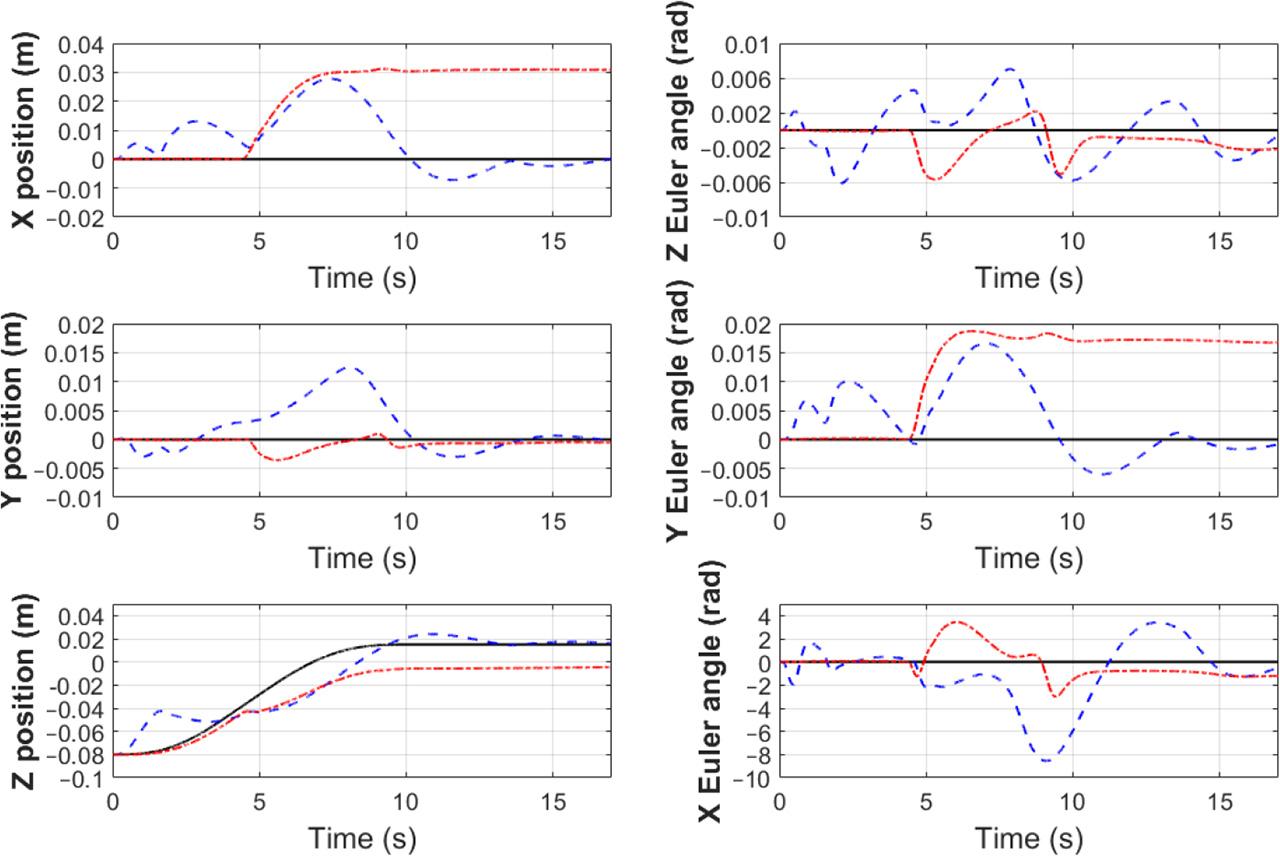 To validate the control system, the following simulation scenario is assumed. The manoeuvre of grasping LAR is considered. The initial configuration of the manipulator is qinit = [q1 q2 q3 q4 q5 q6 q7]T, where q1 = 2.196 rad, q2 = −2.386 rad, q3 = −2.011 rad, q4 = 2.595 rad, q5 = 2.558 rad, q6 = 0.756 rad and q7 = 0.949 rad. At the beginning of the simulation, LAR is located 0.08 m above the end-effector in the Z axis direction. It is assumed that orientations of the end-effector frame and the LAR frame coincide. Moreover, a stationary target is taken into account, so its velocities are set to zero. The desired position of the end-effector is defined to be 0.015 m above the LAR reference frame in the Z axis direction (gripper jaws need to be positioned above the LAR plane, so that grasping is possible). Furthermore, the initial velocities of the satellite-manipulator system are also equal to zero. The simulation lasts 17 s. Within the first 10 s, the desired trajectory of the end-effector in the LAR frame is given. After that time, constant position and orientation are considered as input signals of control algorithm. Such a solution is applied to stop the end-effector in the desired position and orientation as well as to reduce oscillations of the end-effector position and orientation in the final stage of motion.