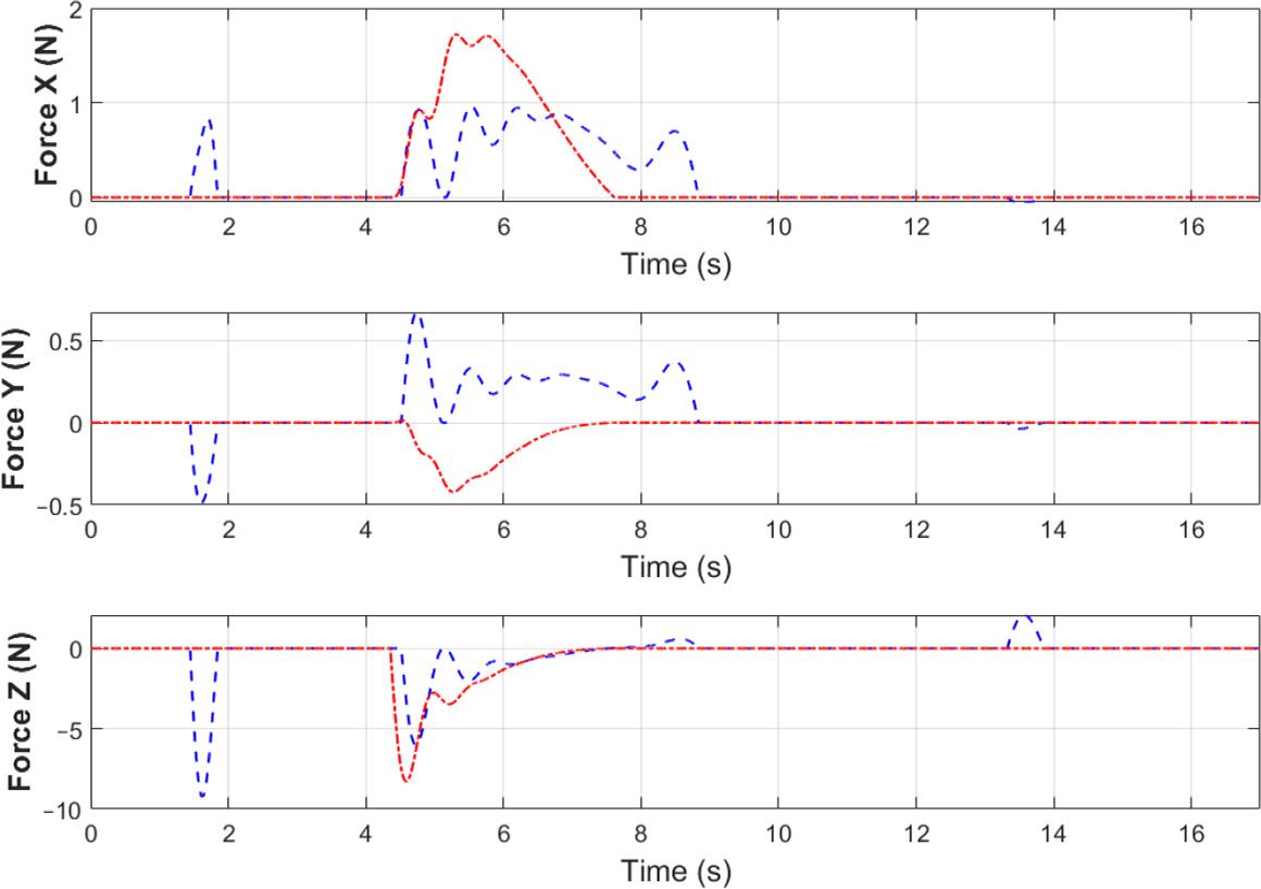 External forces from the contact model (blue dashed line – active 6 DoF force/torque control, red dotted line – Cartesian control)