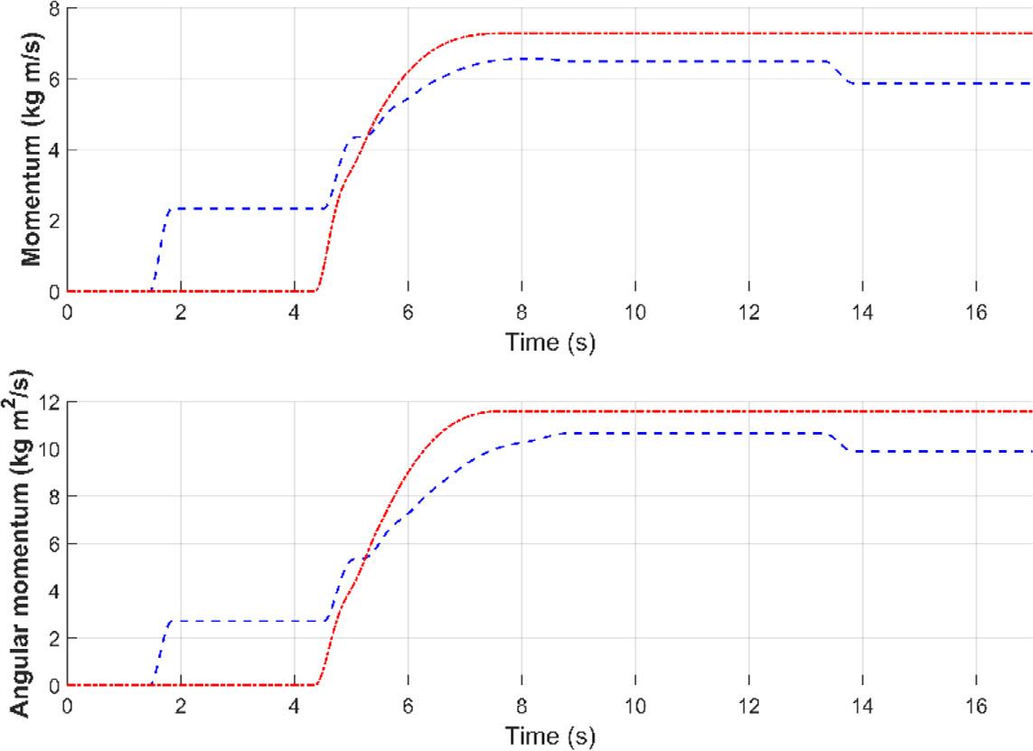Resultant values of momentum and angular momentum of the satellite-manipulator system (blue dashed line – active 6 DoF force/torque control, red dotted line – Cartesian control)