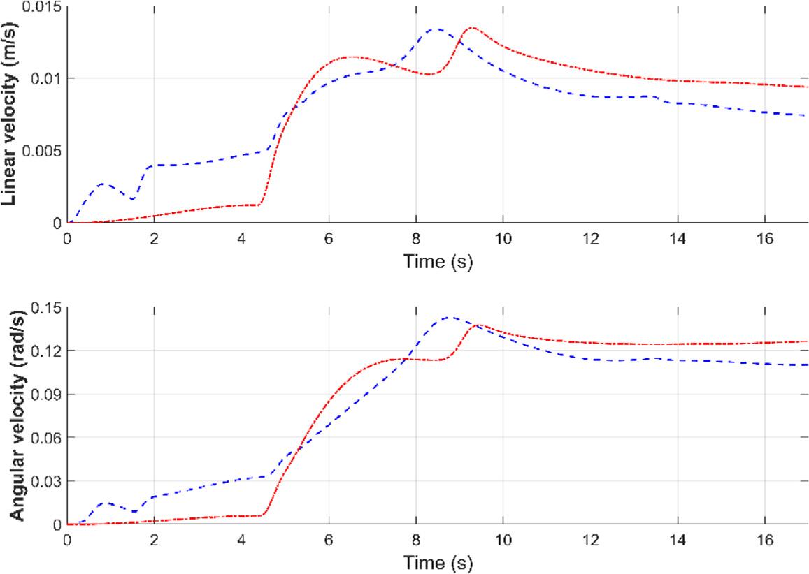 Resultant values of servicing satellite velocities (blue dashed line – active 6 DoF force/torque control, red dotted line – Cartesian control)