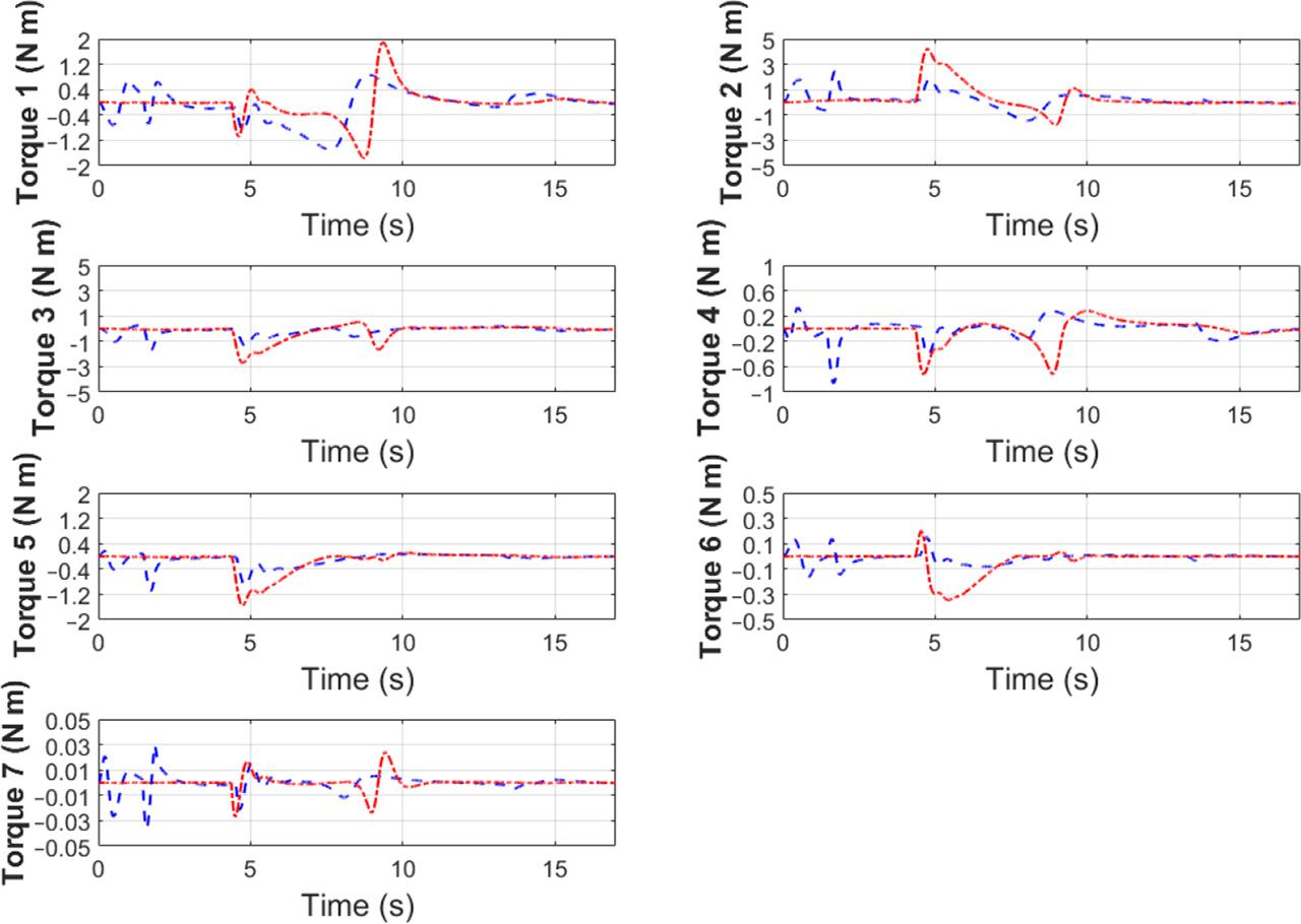 Measured joint torques (blue dashed line – active 6 DoF force/torque control, red dotted line – Cartesian control)