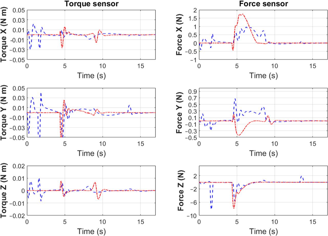 Loads measured between the seventh link and the end-effector (blue dashed line – active 6 DoF force/torque control, red dotted line – Cartesian control)