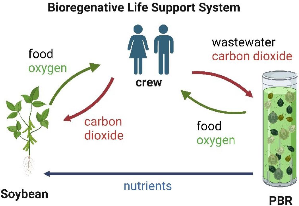 The BLSS scheme includes the cultivation of microalgae in PBR and soybeans in the greenhouse as an oxygen source as well as food. Red arrows indicate waste generated during the mission from the crew (wastewater, carbon dioxide). Green arrows are goods like oxygen and food which are obtained from microalgae and plant cultivation. The blue arrow indicates nutrients provided from microalgae biomass (nitrogen, phosphorus) to plant cultivation. Created with BioRender.com