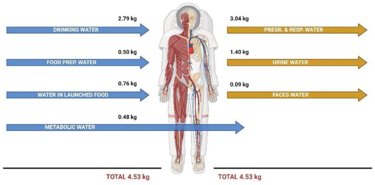 Human settlement in an extraterrestrial environment requires the provision of a life support mechanism. Human settlement in an extraterrestrial environment requires the provision of a life support mechanism (Verseux et al., 2022). This means implementing a system that provides humans with the basic elements necessary for survival. BLSS converts CO2 and wastewater generated during the metabolism of the human body by microorganisms into O2, H2O, and food. The daily water balance of an astronaut is shown in Figure 2.