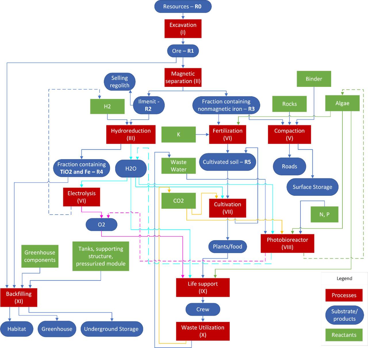 | Hydrogen reduction | R2 regolith | αhr1 | 1 | Photobio-reactor | H2O | αpb1 | 1 |