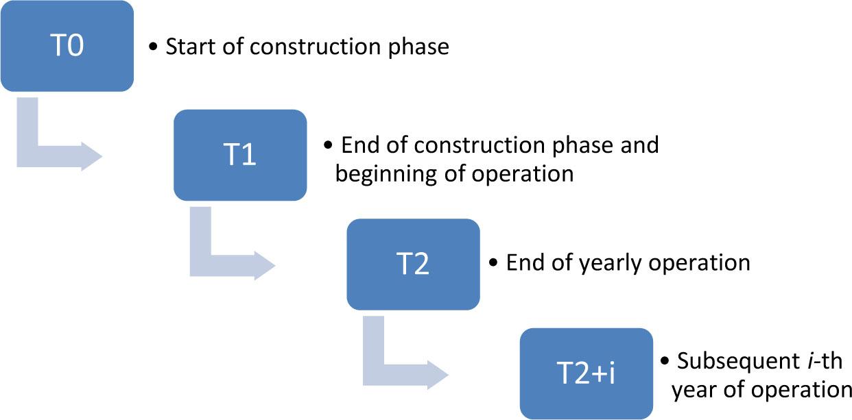 This section presents the concept of an open pit mine fulfilling the objectives defined in the previous section. The main block diagrams describing the flow of lunar regolith, products, and reactants are shown in Figure 3. Blue boxes present substrates and products and include the definition of the state of the lunar regolith (from R0 as a resource to R4 as an Fe-rich fraction of regolith or R5 as cultivated soil). Red boxes represent the process during which the regolith is transformed – all these boxes are described below in dedicated subsections. Green boxes describe reactants or components that need to be (at least partially) delivered from Earth. Figure 3 is supplemented by the definition of phases related to the timeframe of the development of the mine (Figure 4), namely, construction (T0 to T1), the first year of operation (T1 to T2), and subsequent i-th years of operation (T2–T2+i).