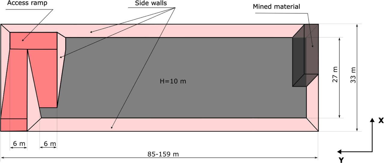 To meet the main objective described in Section 2, which is to sell 300 t of LOx/LHx produced during a 0.45-year period (Vergaaij et al., 2021) and provide the resources that are needed for the partial self-sustainability of the station, assuming a conservation recovery ratio of 30%, 85,632 t of R0 regolith must be excavated annually in the operational phase. This section proposes a general blueprint for an open pit mine site with the required output.