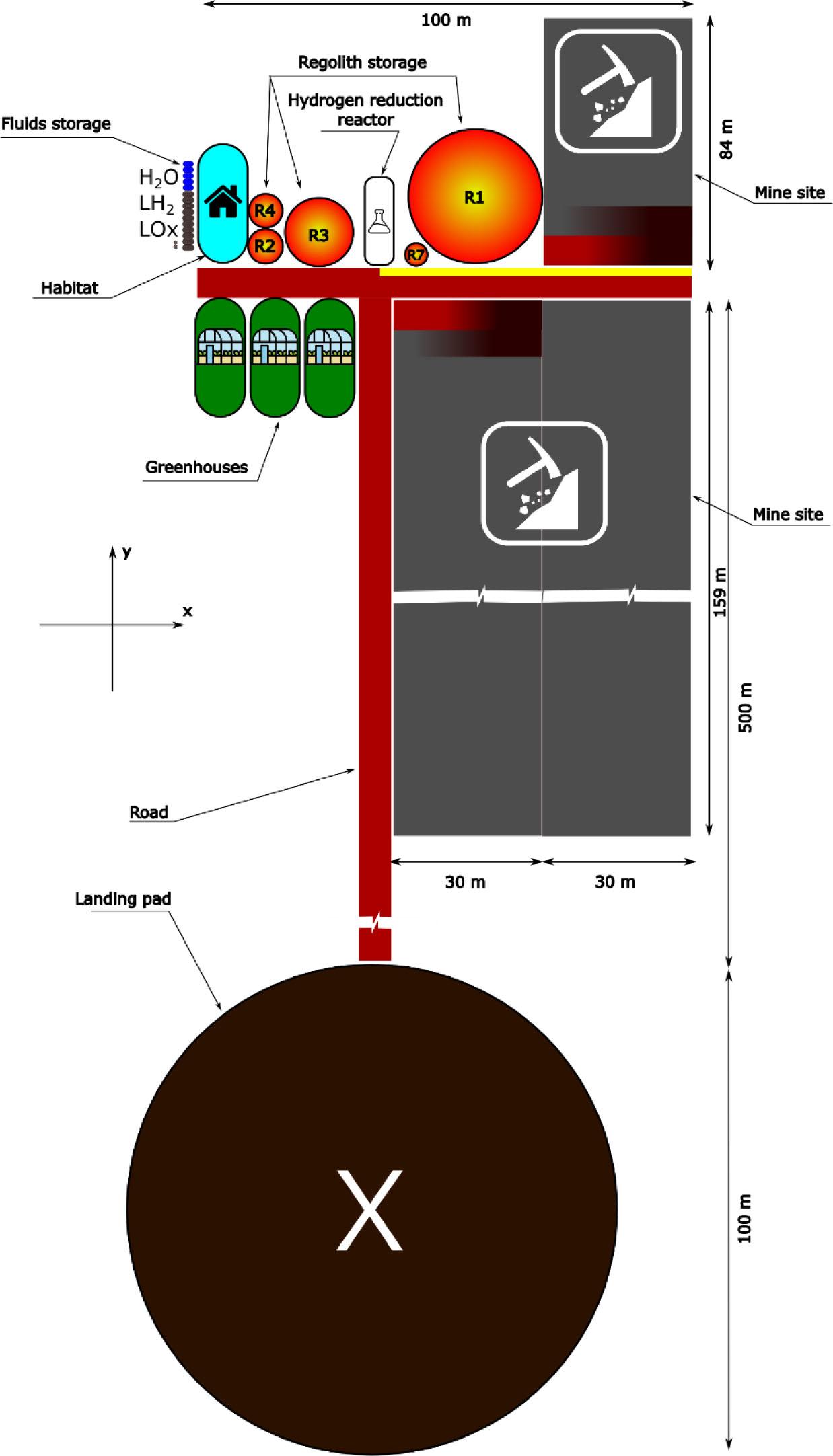 Topology of the proposed open pit mine. Black rectangles describe the mine site, access ramps are indicated in red/black, red/yellow circles represent regolith storage, while blue and black dots show the storage of fluids. Rounded rectangles represent greenhouse (green), habitat (blue), and hydrogen reduction reactor (white) structures. Size of components are in geometrical scale.