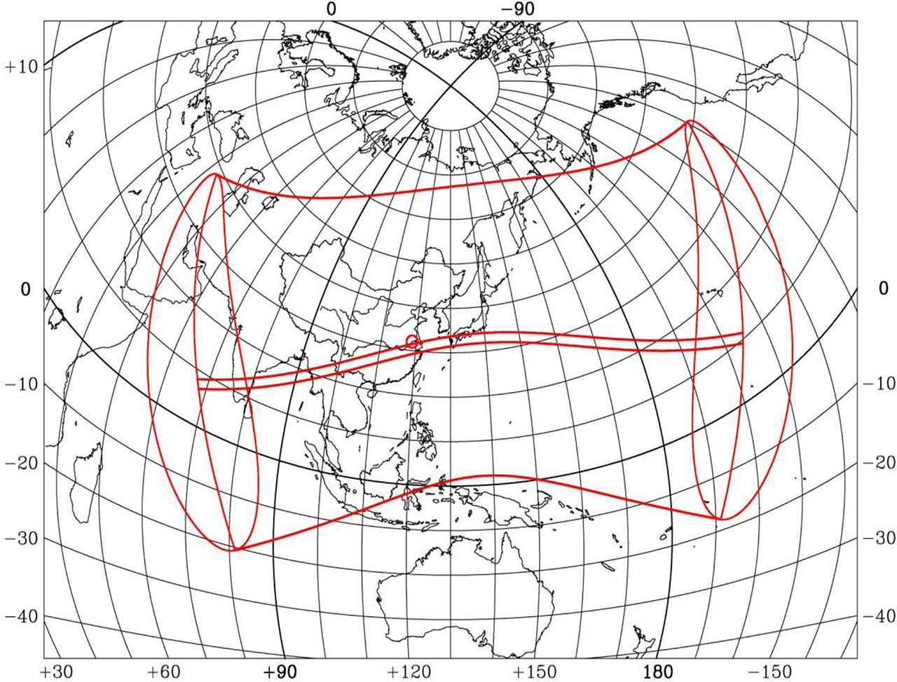 The solar eclipse on June 25, A.D. 1275, had a coincidence time of right ascension for the Sun and the Moon at 3:00:20 (TDT). According to positional relationship among the Sun, the Moon, and the Earth, observable situation of the solar eclipse on the Earth’s surface can be obtained, which is called as solar eclipse path. Figure 1 shows the solar eclipse path of June 25, A.D. 1275 under the TDT time system. In the figure, the narrow belt in the middle indicates the area on the ground where a total solar eclipse can be observed. The two lines approximately parallel to this belt denote the northern and southern boundaries of the area on the ground where a partial solar eclipse can be seen. The two ends of the solar eclipse path show boundaries where the 1st contact and the 4th contact of the eclipse can be observed at sunrise and sunset on the ground. In the figure, the center of the hollow circle displays the observation site in historical documents. The central eclipse’s maximum width was approximately 247 km. Table 1 provides the TDT times for each stage of the solar eclipse, including the partial eclipse begins (the first contact), the total eclipse begins (the second contact), the maximum eclipse, the total eclipse ends (the third contact), and the partial eclipse ends (the last contact).