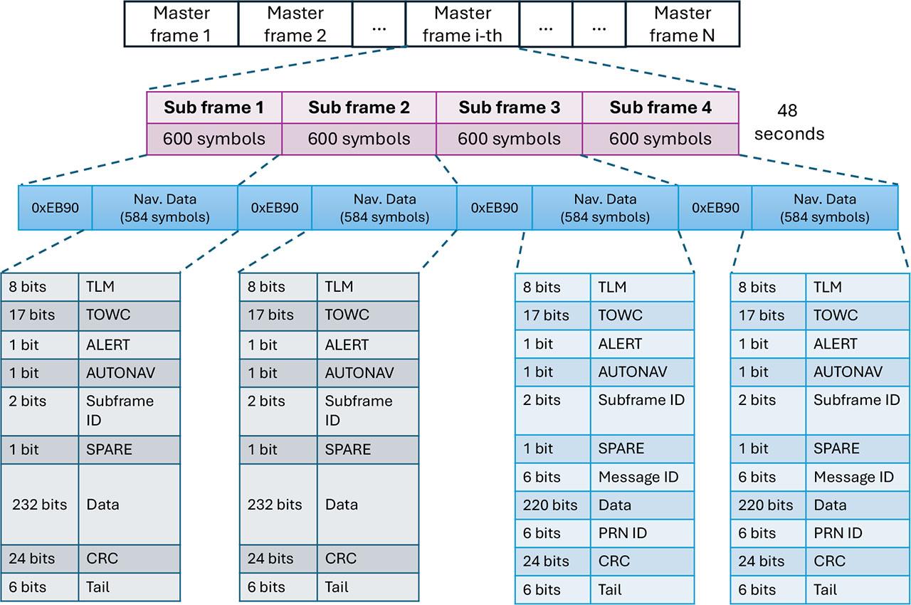Figure 2 shows the navigation message structure of IRNSS/NavIC. The master frame is of 2400 symbols long (48 seconds) made of four subframes as shown in Figure 2. Each subframe is 600 symbols long and is transmitted sequentially in 12-second duration. Each subframe starts with the 16-bit number sync word (0xEB90), followed by 584 bits for symbol code corresponding to 292 data bits, and ends with 6-zero tail bits. The data bits in every subframe transmit TLM, TOWC, Alert, Autonav, Subframe ID, spare bit, navigation data, CRC, and tail bits.